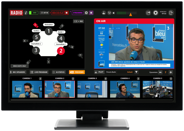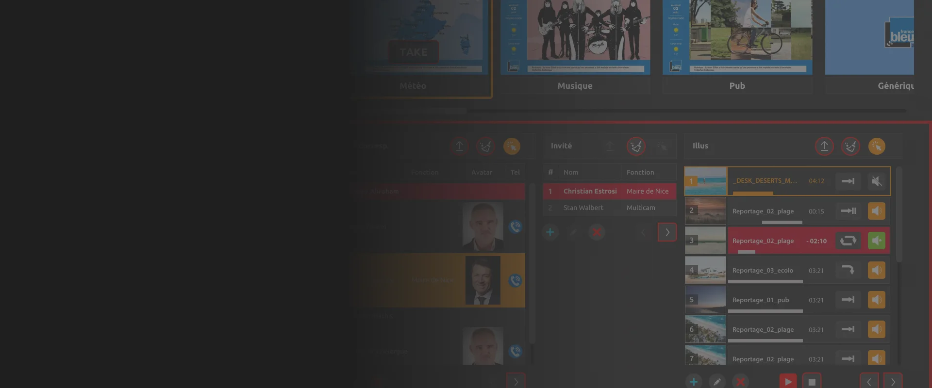 multiCAM RADIO, allows you to produce fully automated Visual Radio without having to have a video technician on hand. works with all the main video platforms: YouTube, Facebook Live, Dailymotion, ...