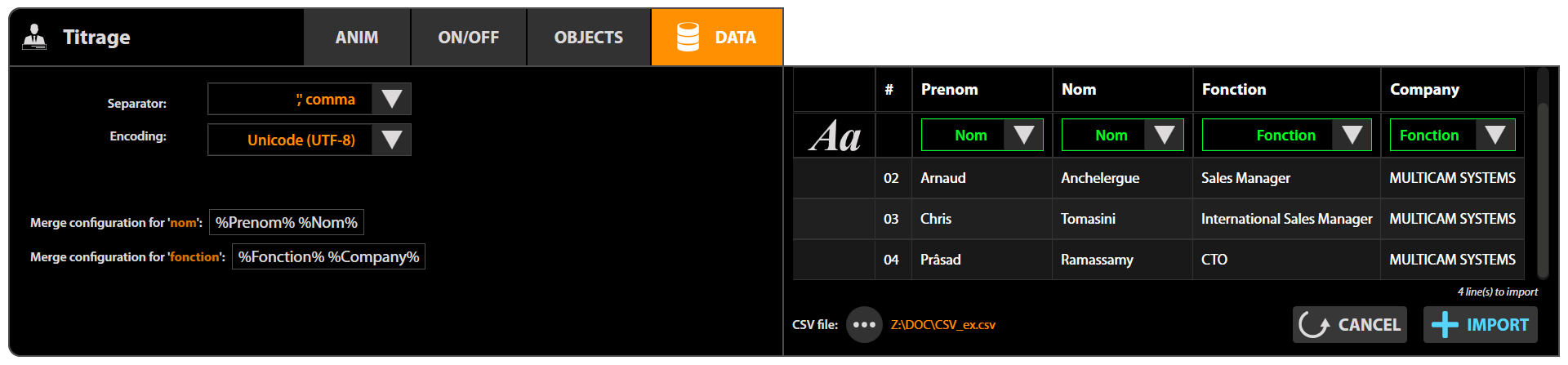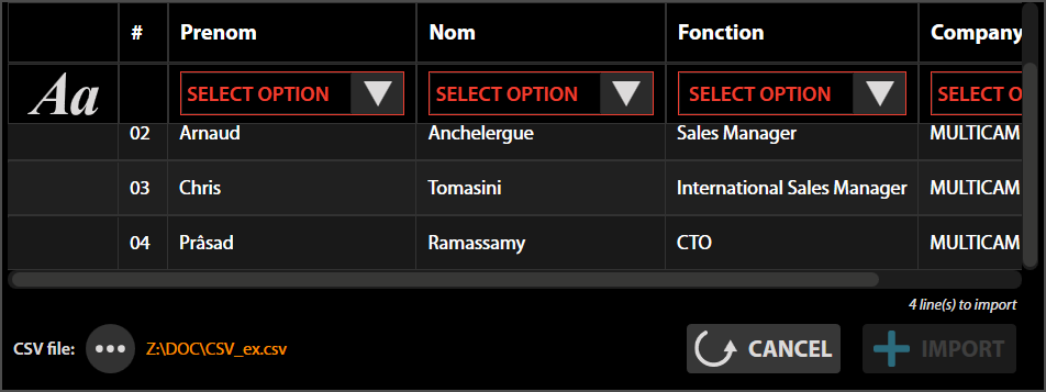 The CSV data separators are not automatically detected. Please select the configuration of your file via the drop-down menu Separator (data separating character) and Encoding (text encoding format).