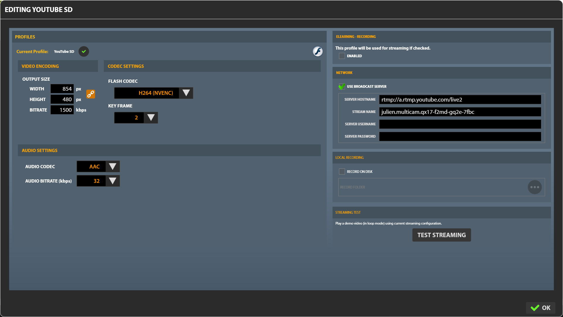 You can check a profile so that it will be used in the event of a broadcast from systems like E-LEARNING and TRACKING : "Enable this profile for E-LEARNING or TRACKING streaming"