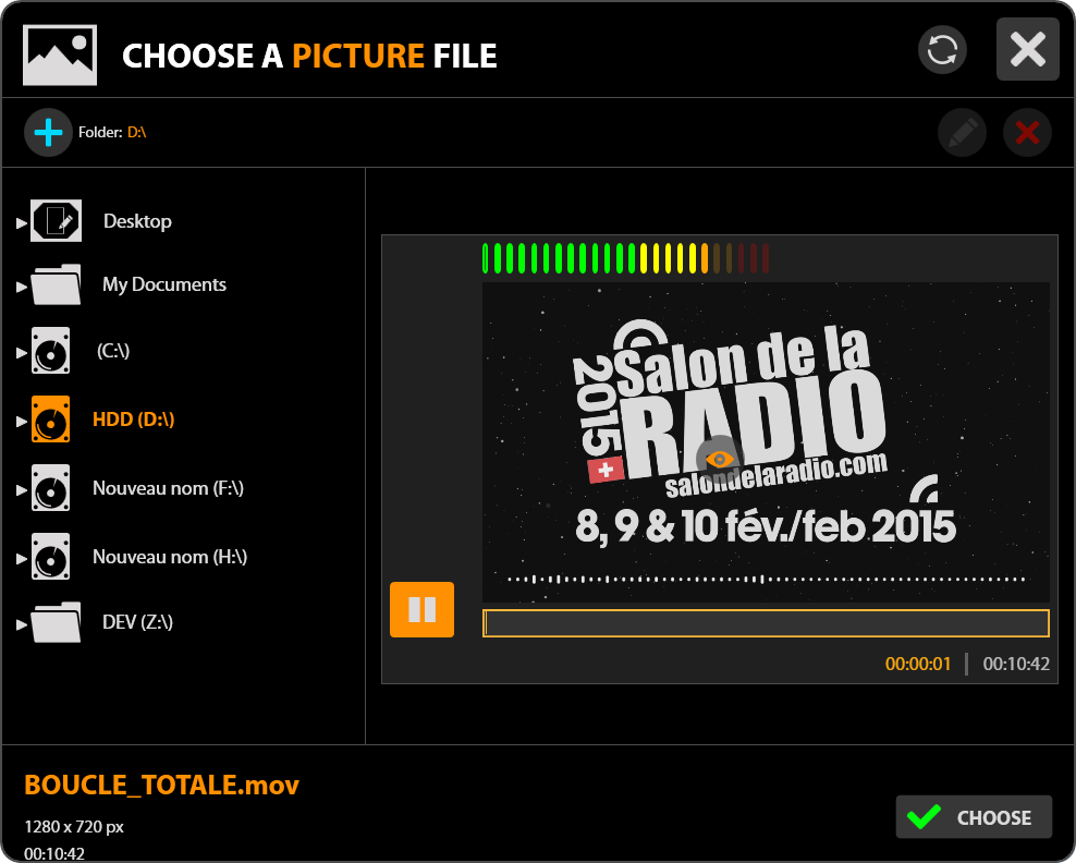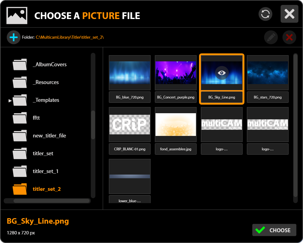 The File Browser allows you to browse through your disks and folders to choose a media to import in MULITCAM: Images for TITLER, Videos for MEDIALIST, etc...