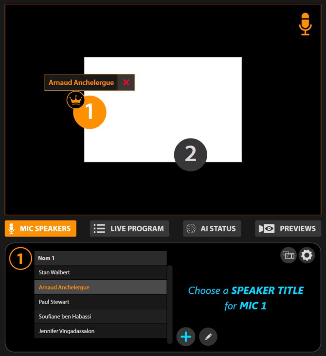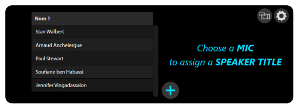 In this section of the Live interface, you can establish the list of participants and attribute them to microphones for automated titling.