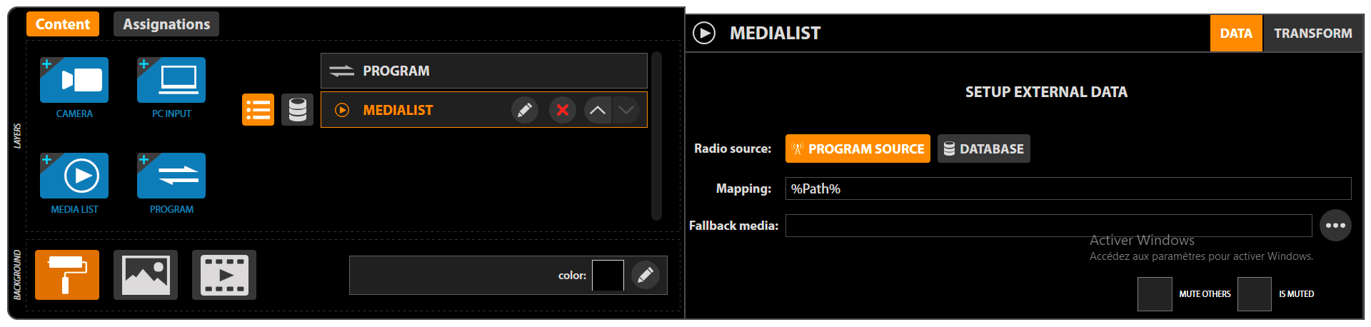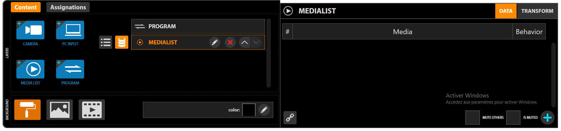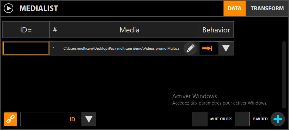 In this mode, you specify directly in Multicam the list of media and the playback (Behavior). The operation of this list is similar to the MEDIALIST module of the STUDIO application. Also, in order to add a media to the list, click on