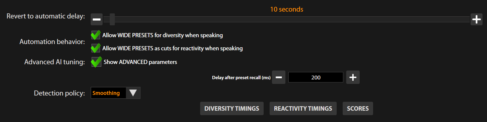 - Diversity timings / Reactivity timings / Scores: We advise against modifying these values. They adjust the filming in detail.