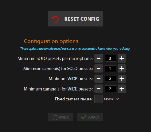 - Minimum SOLO presets per microphone: As a default, the system expects at least 3 presets per microphone. If you do not have enough cameras to meet this condition, you can reduce the number. Your automatic filming will, of course, not be as rich.