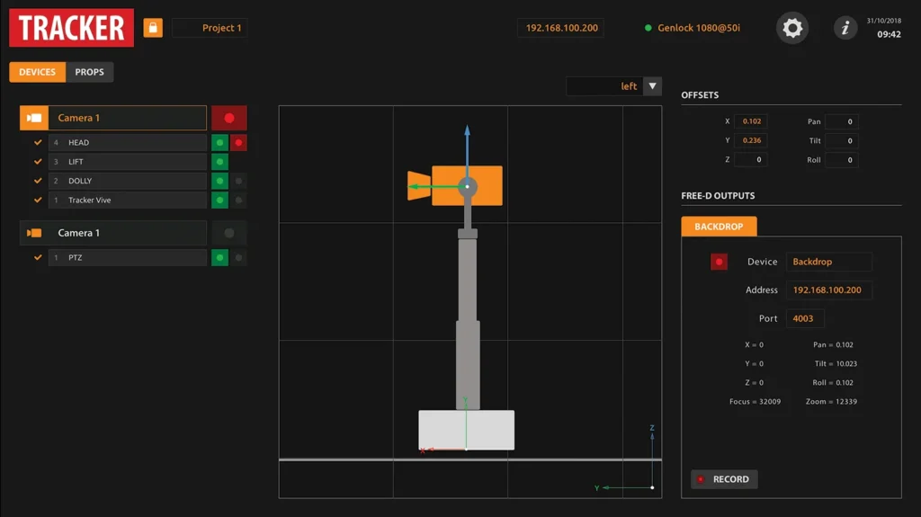TRACKER handles signal aggregation to provide a single FreeD data to the virtual production engine: X, Y, Z axis and Pan, Tilt, Roll of the Head and Focus, Zoom from the Lens.