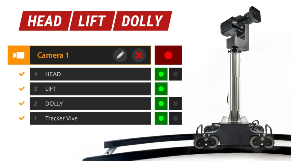 The SPIRIT Slide, Dolly, Lift, and Head robotics systems are self-tracked, each delivering their individual tracking data. For instance, The Slide sends one axis value in real-time for position among the rail (X). The Lift sends the elevation (Y).
